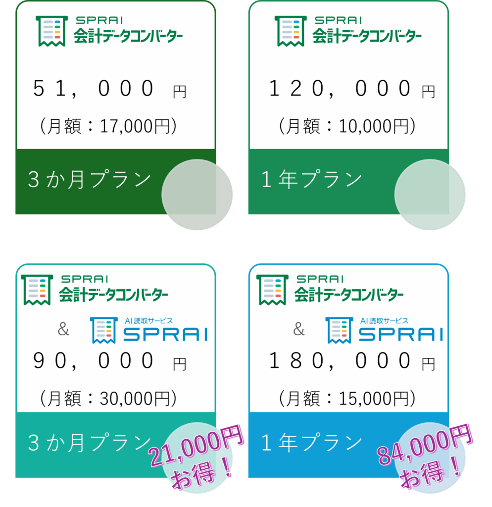 - AI読取りサービスSPRAI:3か月プラン60,000円(月額20,000円) 1年プラン144,000円(月額12,000円) AI利用料金15円(枚/行)